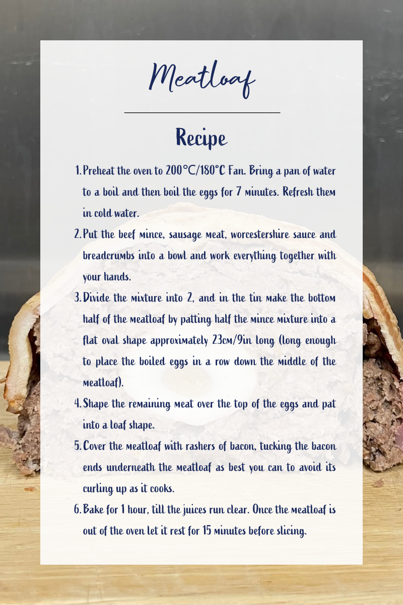 Cover the meatloaf with rashers of bacon, tucking the bacon ends underneath the meatloaf as best you can to avoid its curling up as it cooks.
